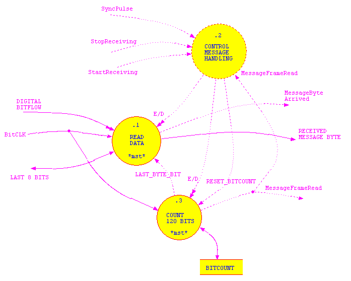 Data transformations (DTRs, solid bubbles in figure 1) are defined with an one-active-input VHDL processes or with a new DFD. Elements with dashed lines in the figure 1 represent the control of the system.